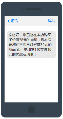我們提供一個(gè)案例:假設(shè)某店鋪目標(biāo)是把店鋪客單價(jià)提升到100元以上,而該店鋪每件寶貝單價(jià)約為50-55元,則可以把該店鋪的優(yōu)惠方式設(shè)置成滿110元減10元,如果客戶購(gòu)買的商品滿110元,則可享受優(yōu)惠立減5元;如果客單價(jià)達(dá)不到110元,則系統(tǒng)向客戶發(fā)送滿110元減5元的提醒短信,提醒客戶只要多購(gòu)買一件或兩件就可以享受此優(yōu)惠了。這樣只要經(jīng)過(guò)一天后就涌現(xiàn)出多張客單價(jià)超過(guò)100元的訂單,客單價(jià)也在慢慢提高。