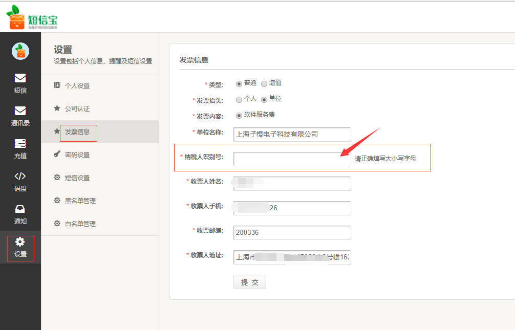 Q:如何在短信寶控制臺中填寫發(fā)票信息并設(shè)置稅號: