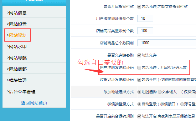 五:系統(tǒng)管理-》網(wǎng)站限制,選擇需要的短信服務(wù)開啟。
