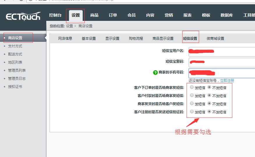 三:系統(tǒng)管理后臺(tái)-》商店設(shè)置-》短信設(shè)置 填寫(xiě)相關(guān)短信信息,短信簽名為商店名稱(chēng),填寫(xiě)完成保存配置即可。