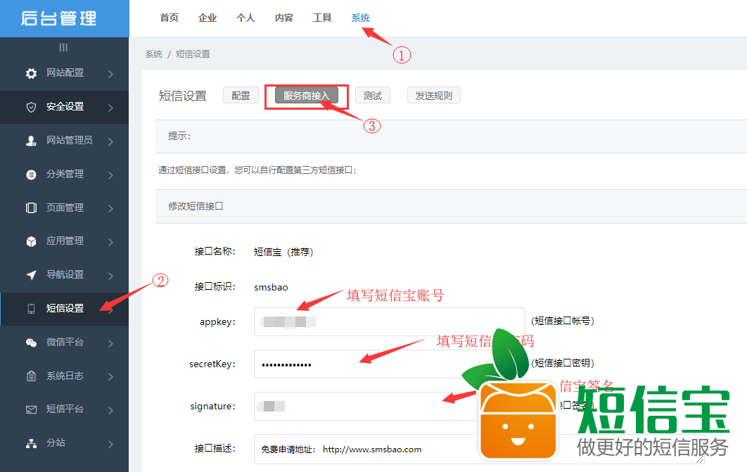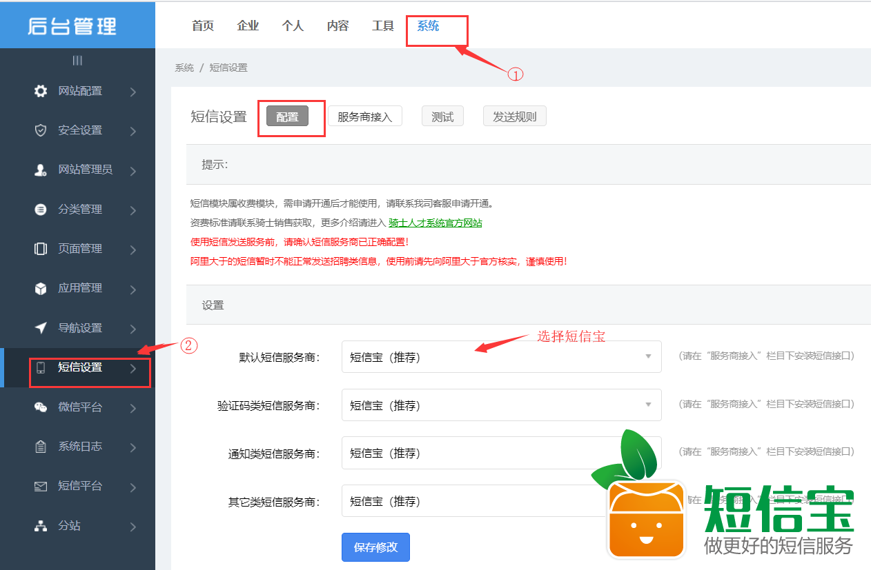 五:登錄系統(tǒng)后臺-》系統(tǒng)-》短信設(shè)置-》服務(wù)商接入,選擇 短信寶配置,填寫保存配置即可。