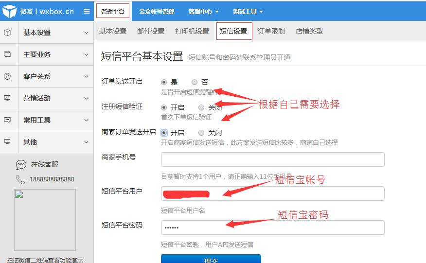 三:進入系統(tǒng)管理后臺->公眾號管理->快捷操作->短信設(shè)置 填寫相關(guān)短信配置信息,填寫完成保存配置即可。