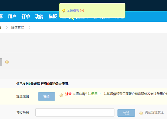 五.點(diǎn)擊短信管理,填寫您的手機(jī)號(hào)碼進(jìn)行測(cè)試,提示發(fā)送成功說(shuō)明您的短信插件安裝成功