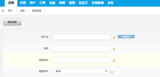 四.點(diǎn)擊左側(cè)導(dǎo)航欄,短信設(shè)置,并填寫您的短信寶配置信息