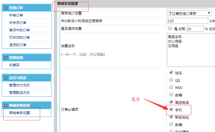五. 選擇:商城系統(tǒng)管理 -> 商城參數(shù)設(shè)置 -> 訂單必填項(xiàng)。