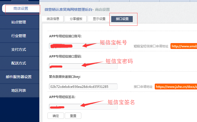 三:進(jìn)入系統(tǒng)管理后臺(tái)-》系統(tǒng)設(shè)置-》商店設(shè)置-》接口設(shè)置,填寫相關(guān)短信配置信息,填寫完成后,確定保存即可。