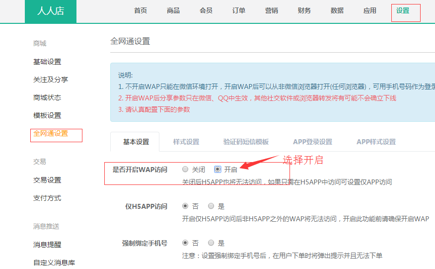 五:開啟在WAP模式在 設(shè)置->商城->全網(wǎng)通設(shè)置 開啟WAP訪問。