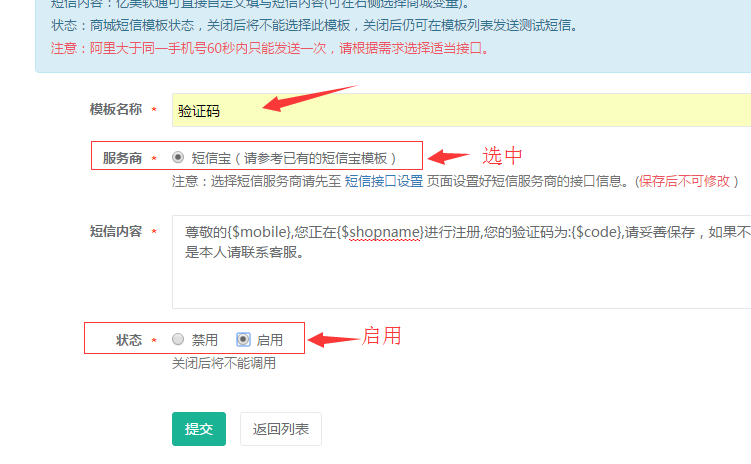 服務(wù)商選擇短信寶,狀態(tài)開啟,短信的模板內(nèi)容為: