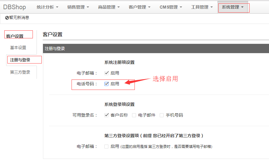 五:?jiǎn)⒂檬謾C(jī)注冊(cè)項(xiàng) 系統(tǒng)設(shè)置->客戶設(shè)置->注冊(cè)與登陸 啟用電話號(hào)碼 保存配置。