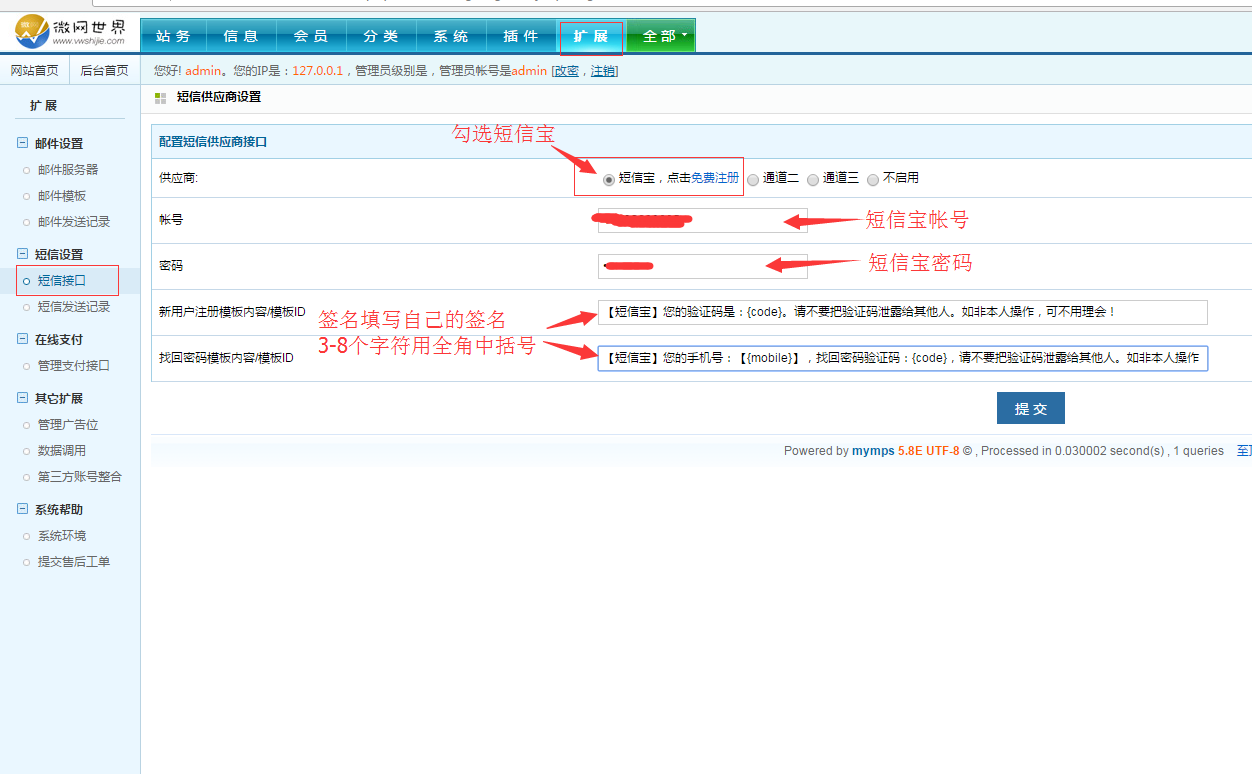 二:短信的配置:登錄系統(tǒng)后臺(tái)-》擴(kuò)展-》短信接口,選擇短信寶,填寫(xiě)短信寶配置信息并提交保存。