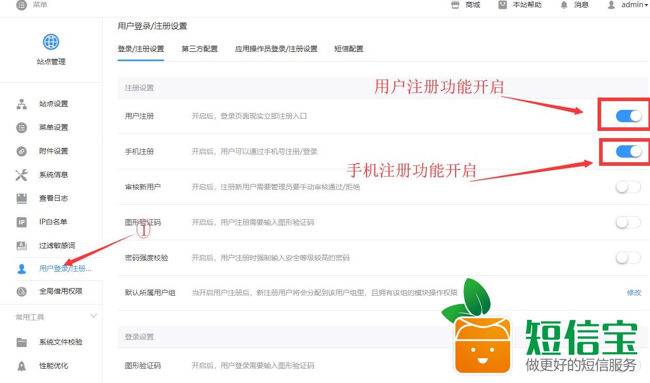 四:短信功能開啟:系統(tǒng)管理->站點(diǎn)設(shè)置->用戶登錄/注冊設(shè)置->登錄/注冊設(shè)置,開啟注冊功能和手機(jī)注冊功能