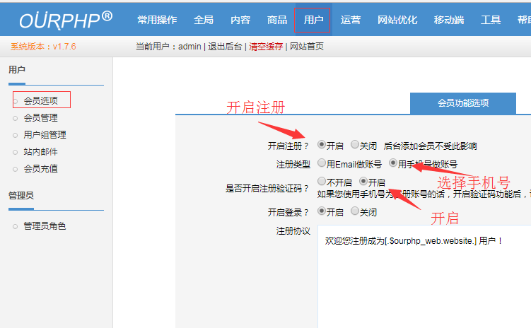 四:開啟手機(jī)注冊:進(jìn)入后臺(tái)->用戶-》會(huì)員選項(xiàng),選擇手機(jī)注冊。