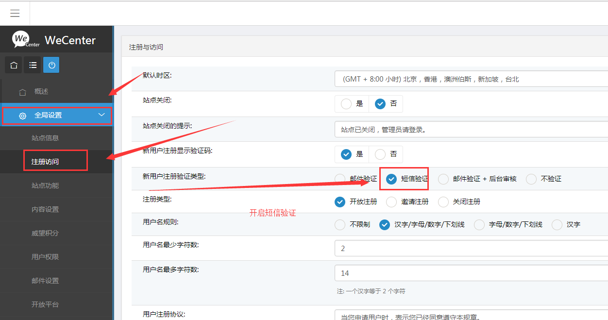 五:設置開啟短信驗證,進入系統(tǒng)后臺-》全局設置-》注冊訪問,勾選短信驗證。