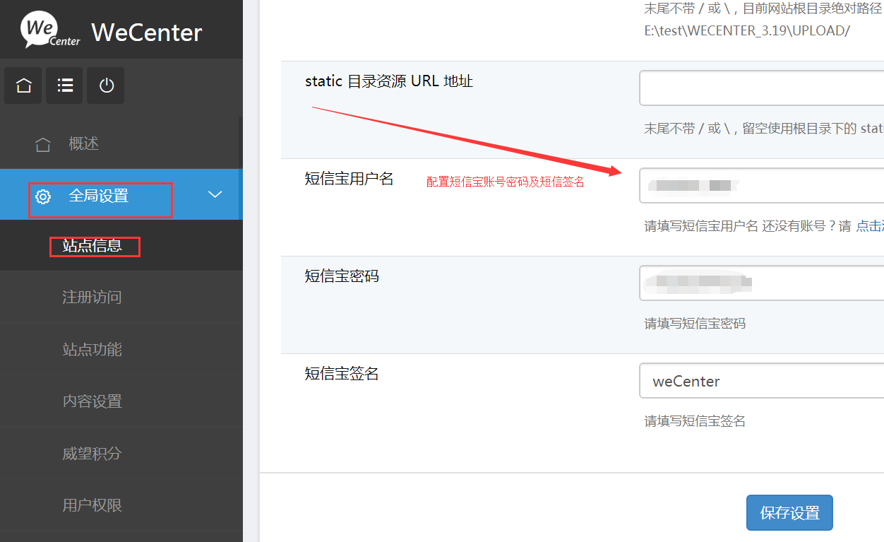 四:登錄系統(tǒng)后臺,全局設置-》站點信息,填寫短信寶配置信息。