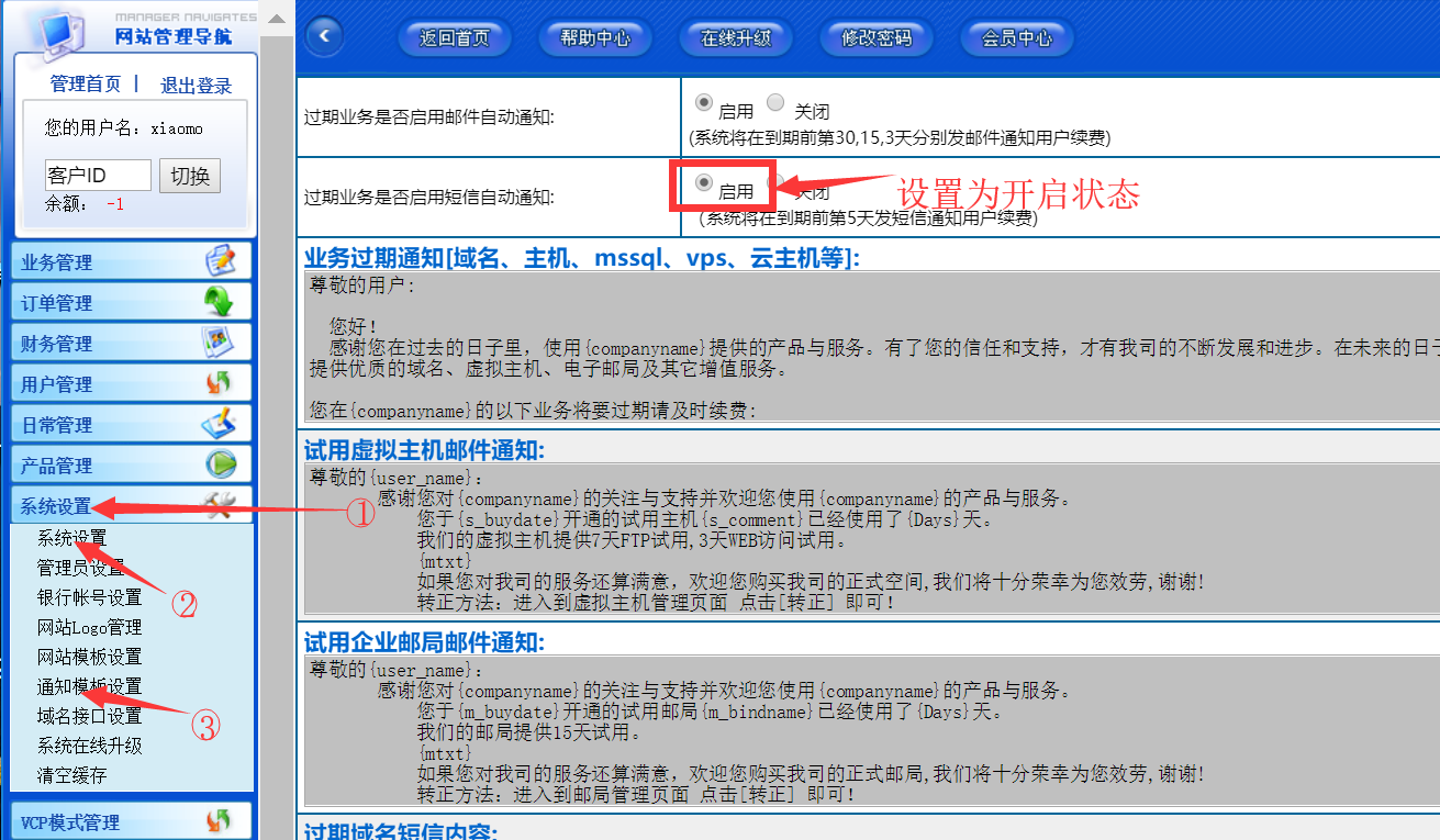 2:進(jìn)入系統(tǒng)管理后臺->系統(tǒng)設(shè)置->通知模板設(shè)置 將過期業(yè)務(wù)是否啟用短信自動通知 設(shè)置為啟用
