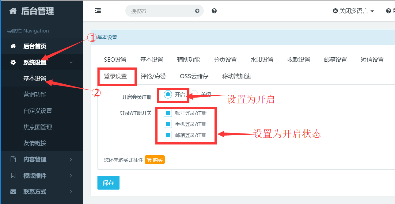 4:進(jìn)入系統(tǒng)后臺->系統(tǒng)設(shè)置->基本設(shè)置->登錄設(shè)置,開啟會員注冊,打開賬號登錄/注冊,手機(jī)登錄/注冊,郵箱登錄/注冊功能打開