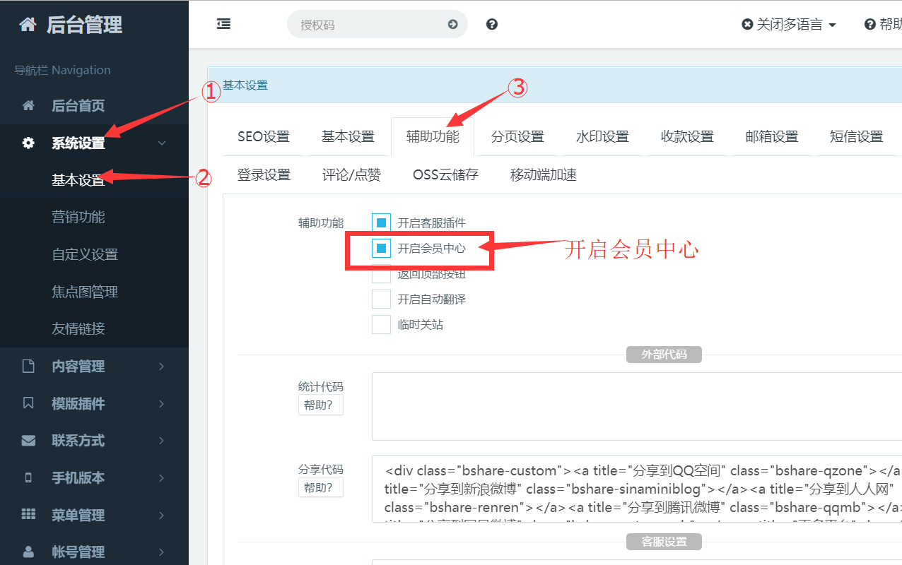 5:進(jìn)入系統(tǒng)后臺->系統(tǒng)設(shè)置->輔助功能,開啟會員中心