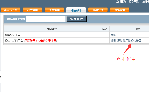 五:后臺->短信郵件->短信接口列表->使用短信寶增值平臺。