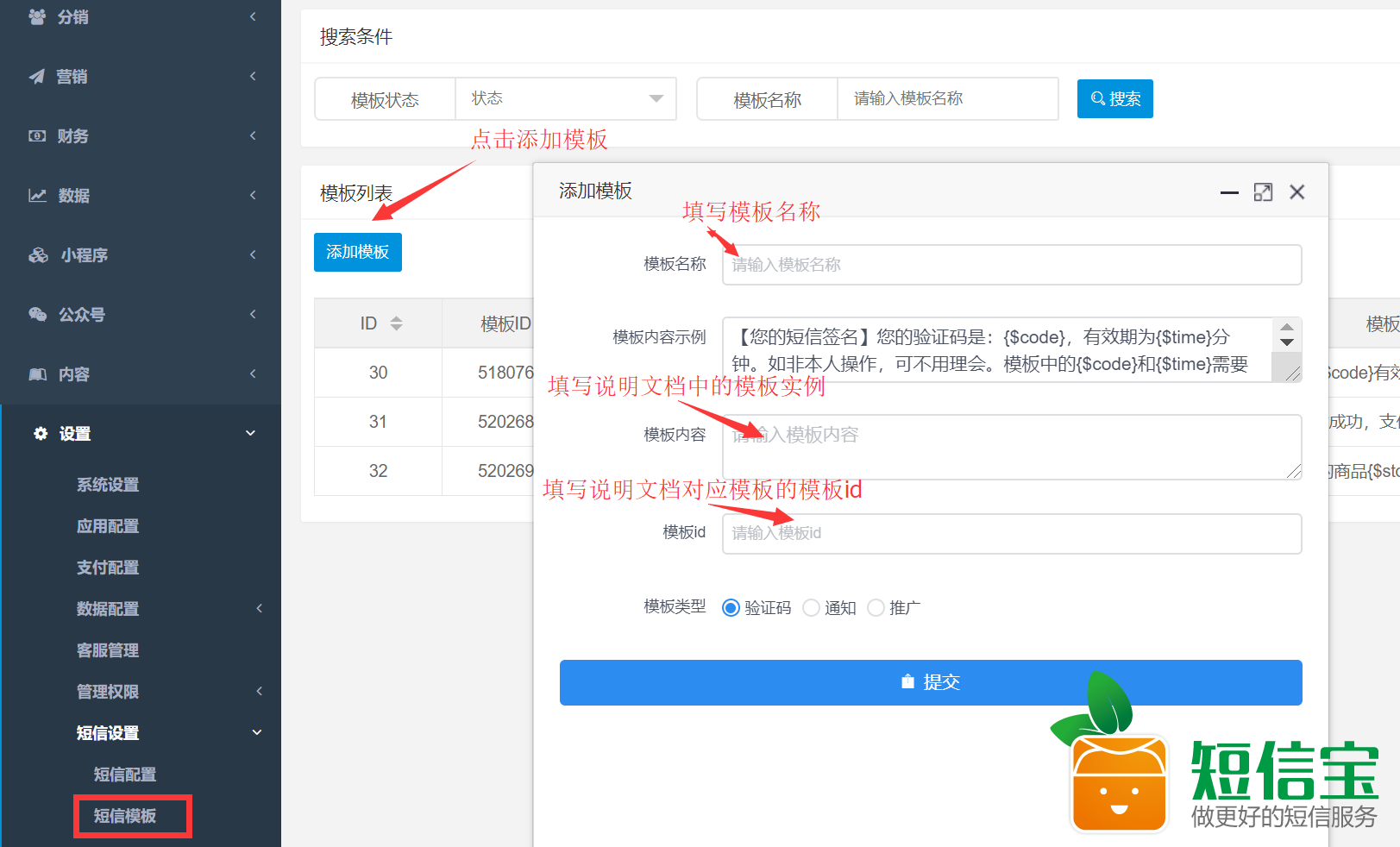 4:進入系統(tǒng)后臺->設(shè)置->短信設(shè)置->添加模板,填寫所需模板