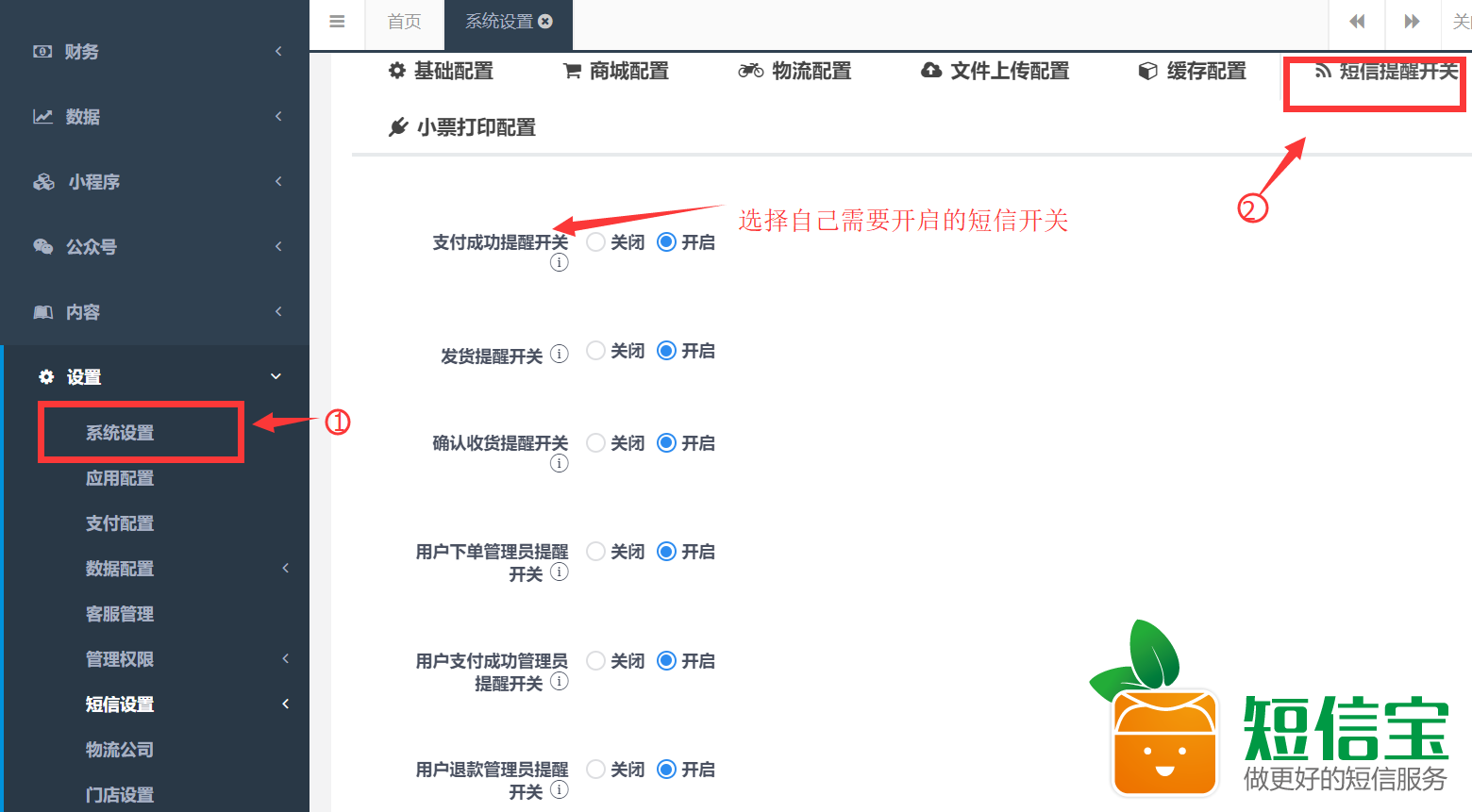5: 進入系統(tǒng)后臺->系統(tǒng)設(shè)置->短信提醒開關(guān),打開需要短信發(fā)送開關(guān)