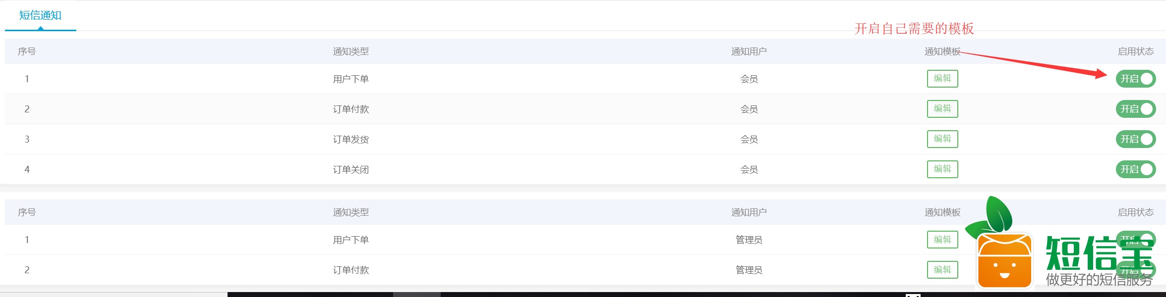 4:在當(dāng)前頁面短信通知開啟所需要的通知模板(不用填寫模板ID)。