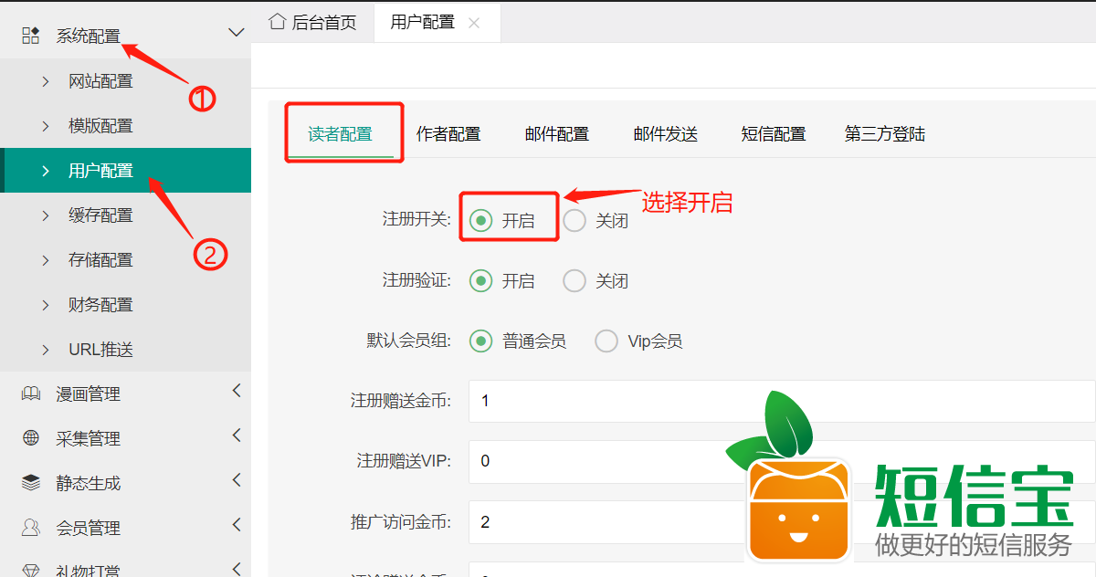 5:開啟會員注冊短信驗(yàn)證方法:管理后臺-》系統(tǒng)配置-》用戶配置-》讀者配置 選擇注冊驗(yàn)證 開啟