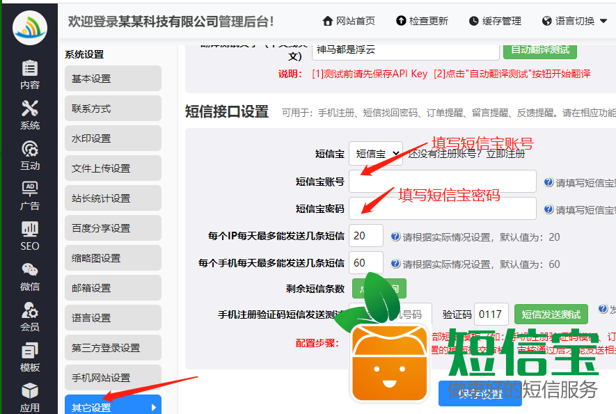 3:進(jìn)入管理后臺(tái)-》設(shè)置-》其他設(shè)置-》短信接口設(shè)置,填寫你的短信寶賬號(hào)、密碼