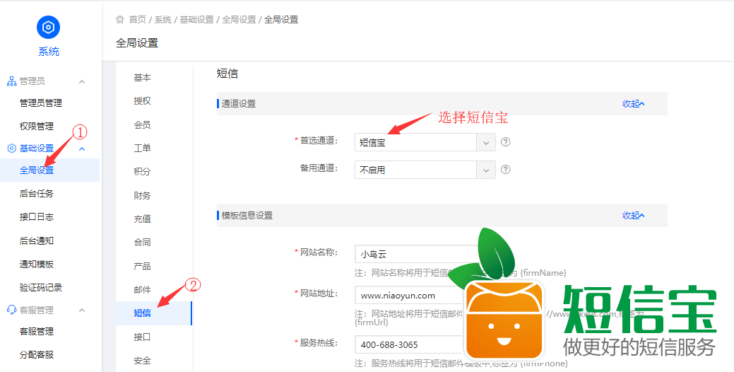 2:進(jìn)入系統(tǒng)后臺(tái)-》系統(tǒng)-》系統(tǒng)管理-》全局設(shè)置-》短信,首選通道選擇:短信寶,并在短信通道一下方填寫您的相關(guān)短信寶配置信息,填寫完成后保存設(shè)置即可。