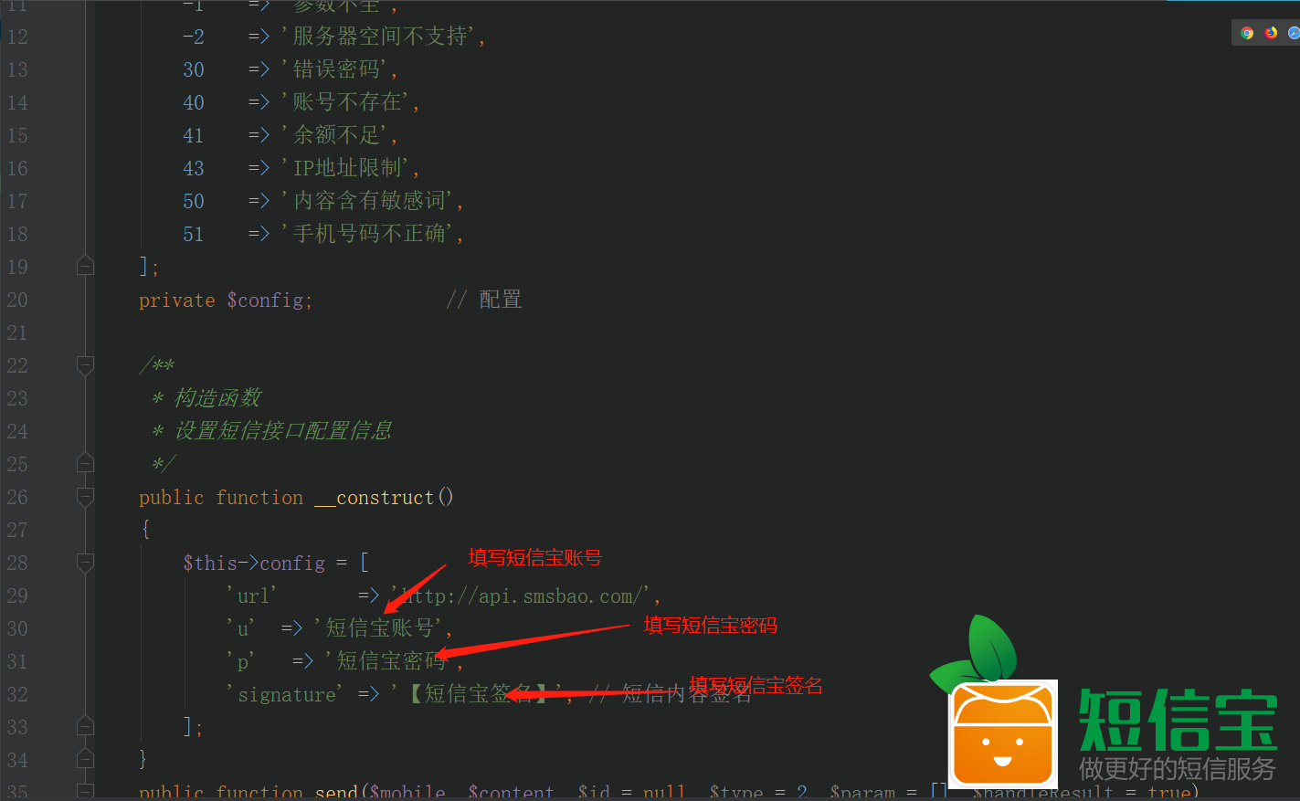 3:打開(kāi)\libs\Niaoyun\Common\Sms\SmsBaosms.class.php 大概在20行填寫好短信寶賬號(hào)密碼簽名