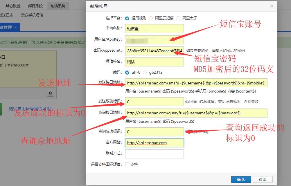 接口查看沒問題,然后我們?nèi)ズ笈_的配置->短信系統(tǒng)->短信平臺管理中添加短信寶賬戶的: