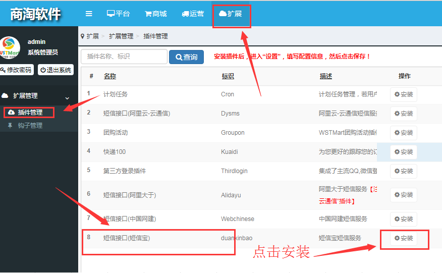 WSTMart商淘系統(tǒng)一個是免費開源的系統(tǒng)一鍵安裝之后,打開后臺系統(tǒng)擴(kuò)展 => 插件管理 找到短信寶接口插件 進(jìn)行安裝